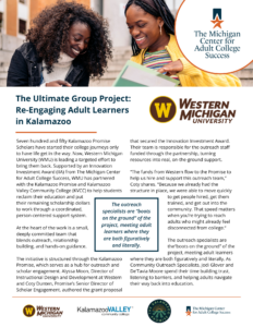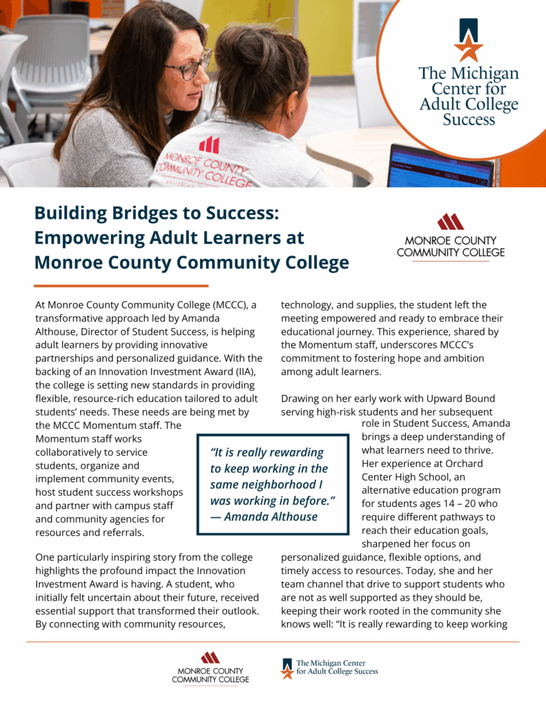 The Michigan Center for Adult College Success is actively supporting nine institutions through our Innovation Investment Awards. These awards help colleges implement best practices and pilot new strategies that serve adult students, ultimately increasing completion rates.